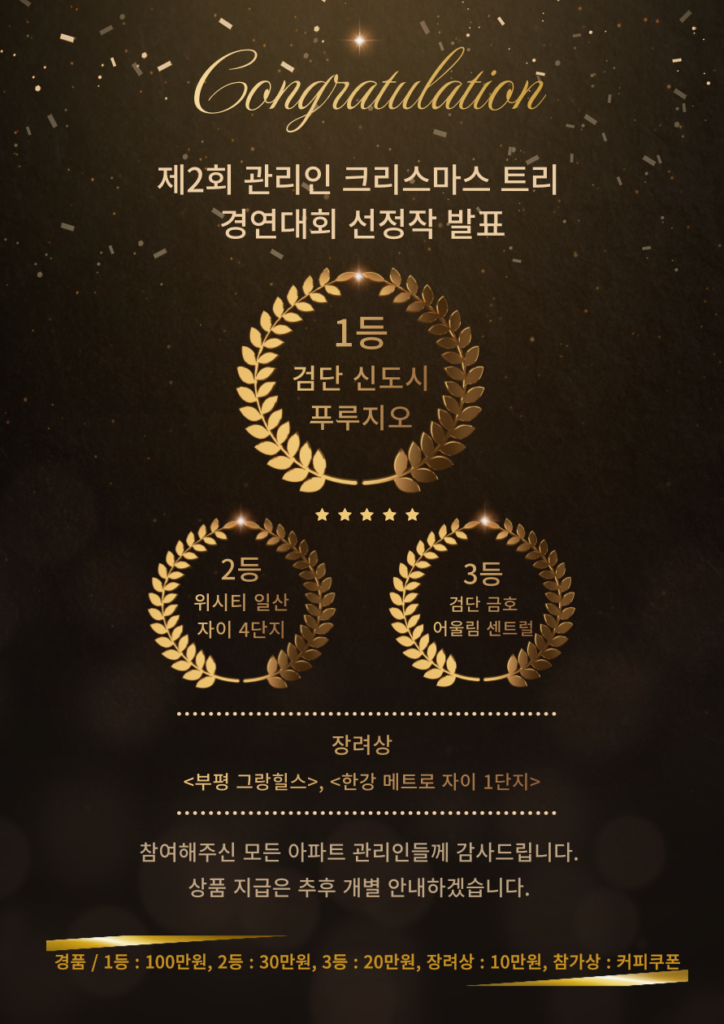 ▶ 경품지급은 당선되신 단지(담당자)와 의논하여 2월초에 일괄 지급하도록 하겠습니다. 축하드립니다.
