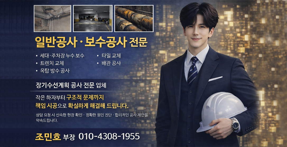 옥상방수를 위한 전체 점검을 의뢰하였습니다. 제가 보지 못한 벽체, 지붕, 배수로 및 전반적인 점검을 세심하게 확인해주셨습니다. 조사해주신 자료를 토대로 회의자료가 만들어질텐데 너무 감사드립니다. 직원에게 현장점검을 지시하기에는 무리가 있어서 부담스러웠는데 옥상방수 공사 예정인 단지는 한번즈음 의뢰하셔서 상담받아 보시길 추천드립니다.
